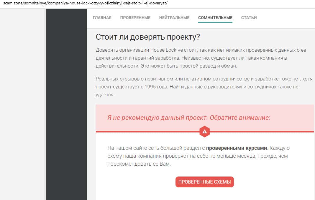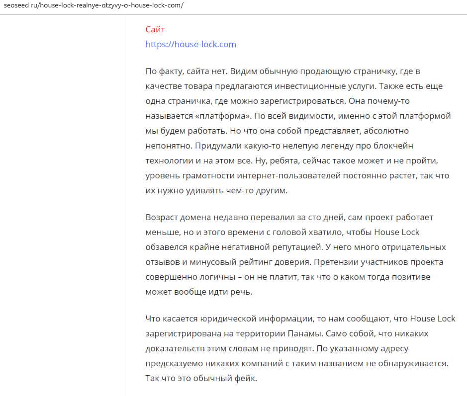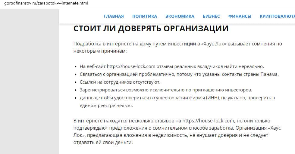 Сайт-отзовик не рекомендует вкладывать деньги в аферу Хаус Лок