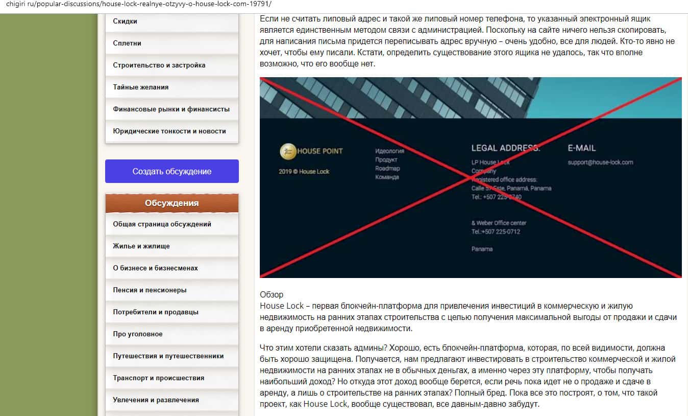 Человек высказал свое мнение касательно работы лохотрона HouseLock на одном из форумов. По его словам, это очередной проект, который предлагает делать инвестиции на вложениях якобы в недвижимость. На самом сайте указан липовый адрес телефона и электронная почта, которой не существует.