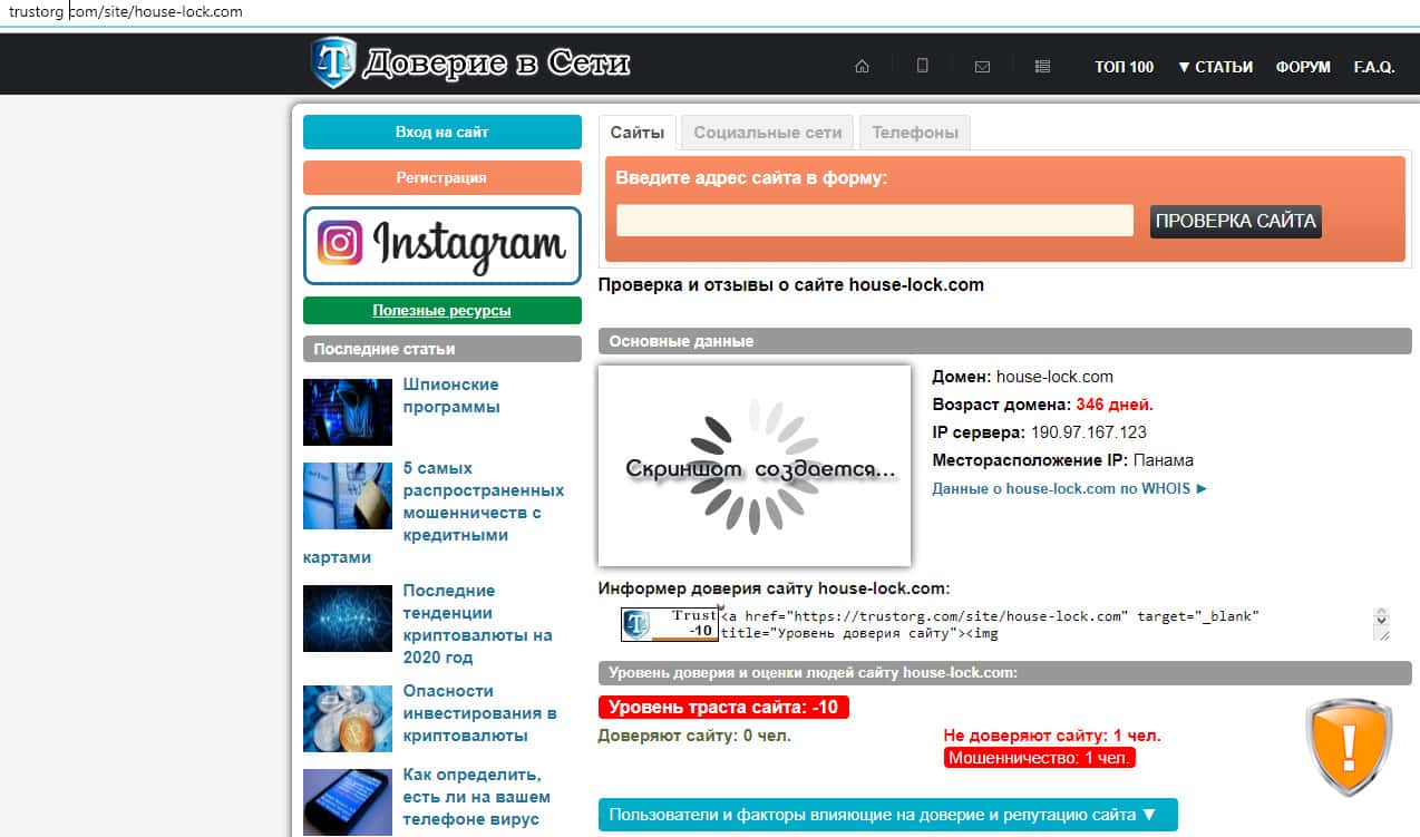 Лохотронщики HouseLock используют прописку своего домена в Панаме и возраст их сайта не превышает даже года на момент создания данной статьи. Это очень настораживает, так как не сходится период их деятельности и период работы сайта. Уровень траста в минусовом значении, да еще и нет к нему доверия со стороны интернет-пользователей.