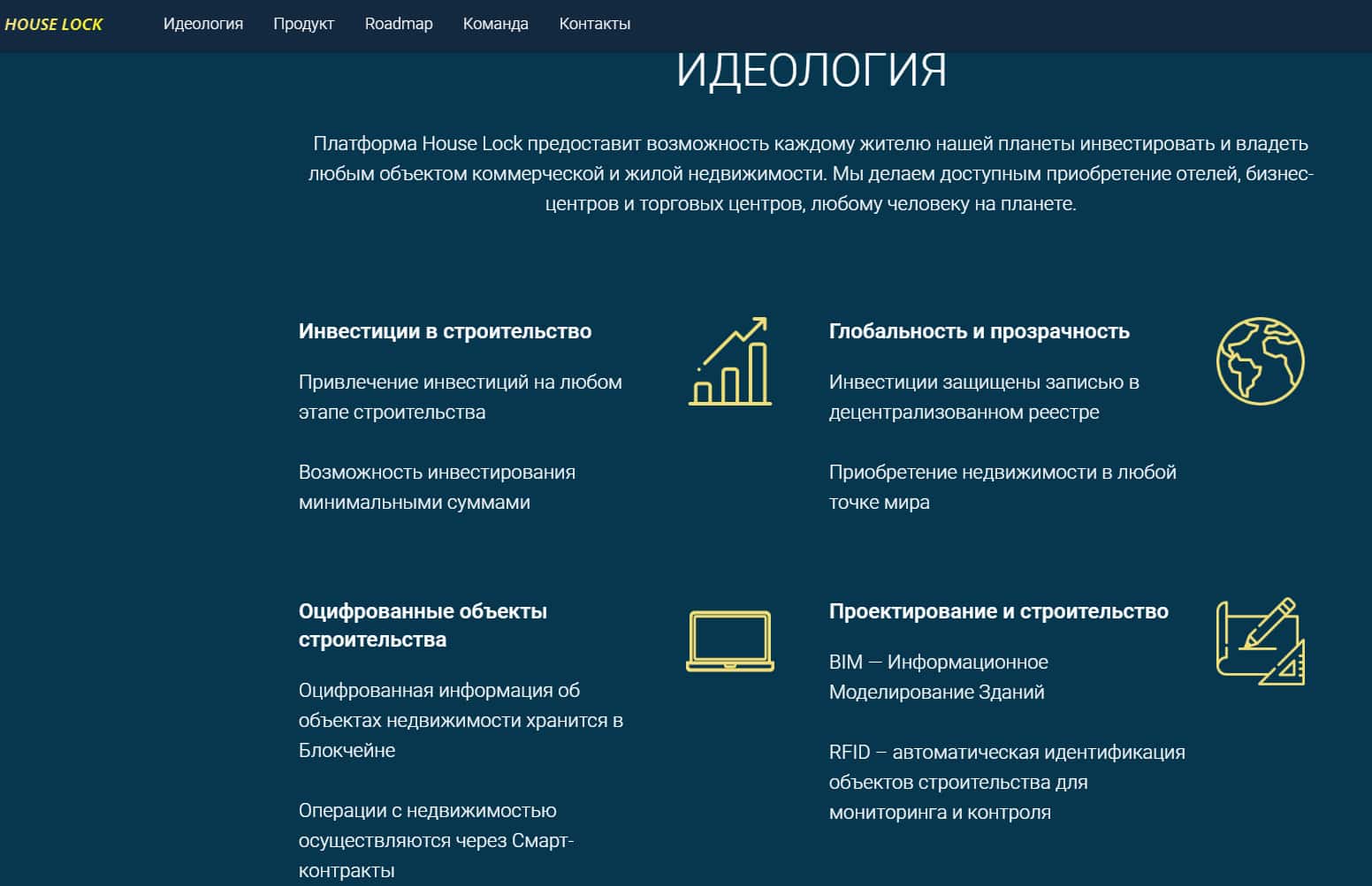 По своей сути, контора HouseLock работает на основе блокчейн, но это далеко не так. да, действительно так пишут на сайте, но если проверить, то доказательств этому нет. Поэтому можно считать ее типичным лохотрон-проектом. Также стоит отметить, что данная афера имела иное название - Лига Домов, которая соскамилась.