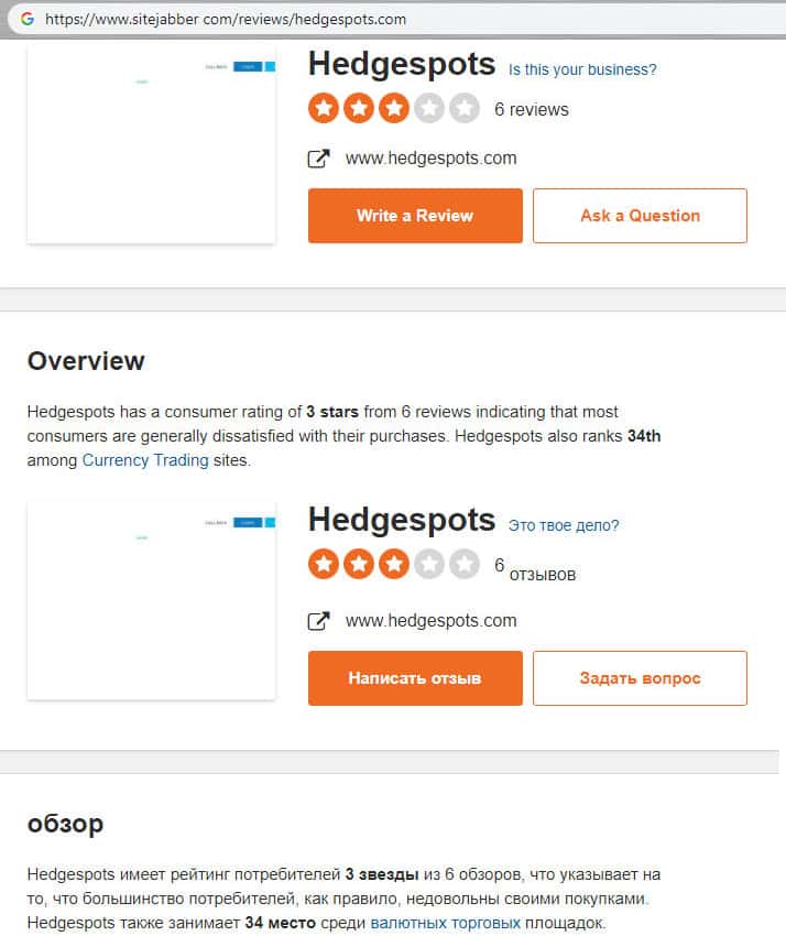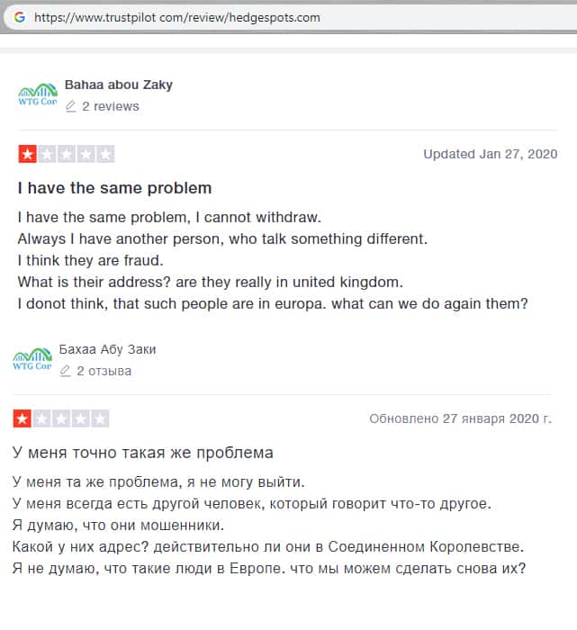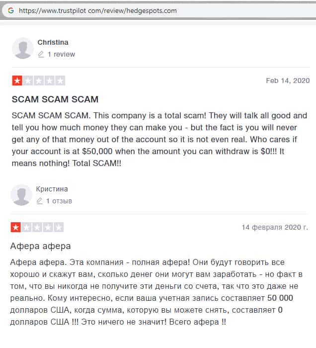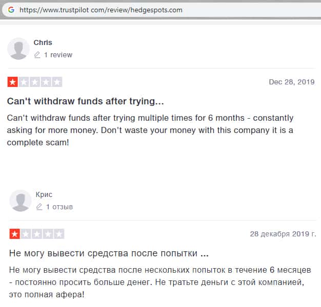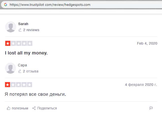 trustpilot com - сайт с отзывами о шарашкиной канторе HedgeSpots