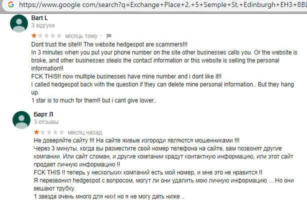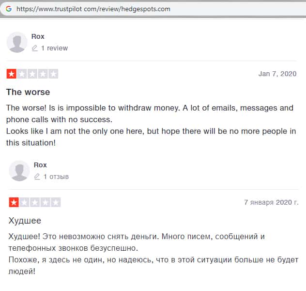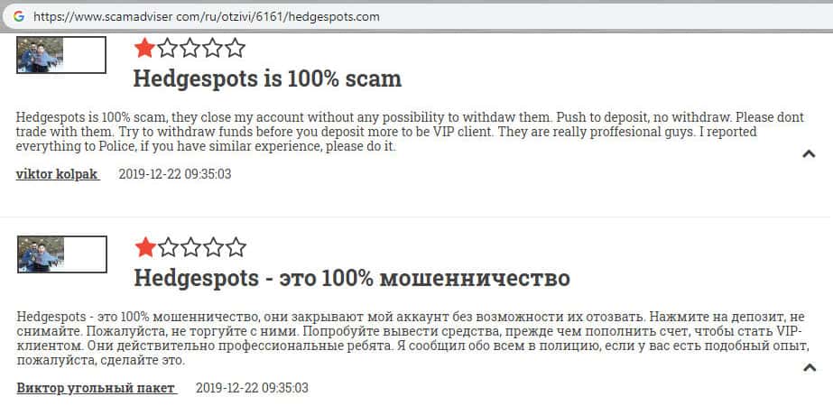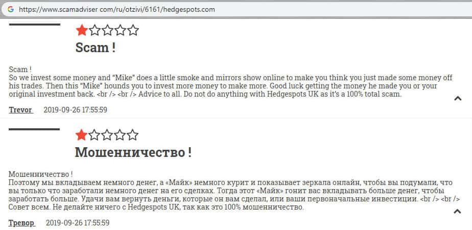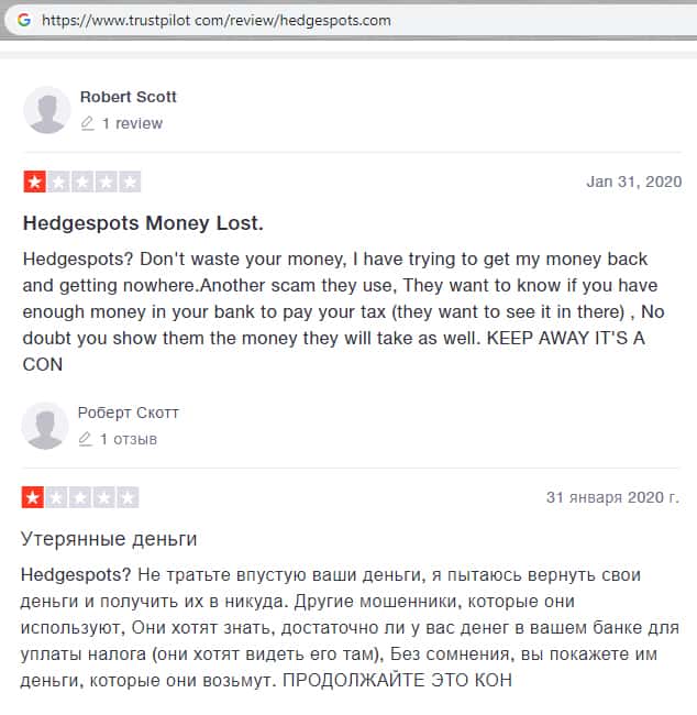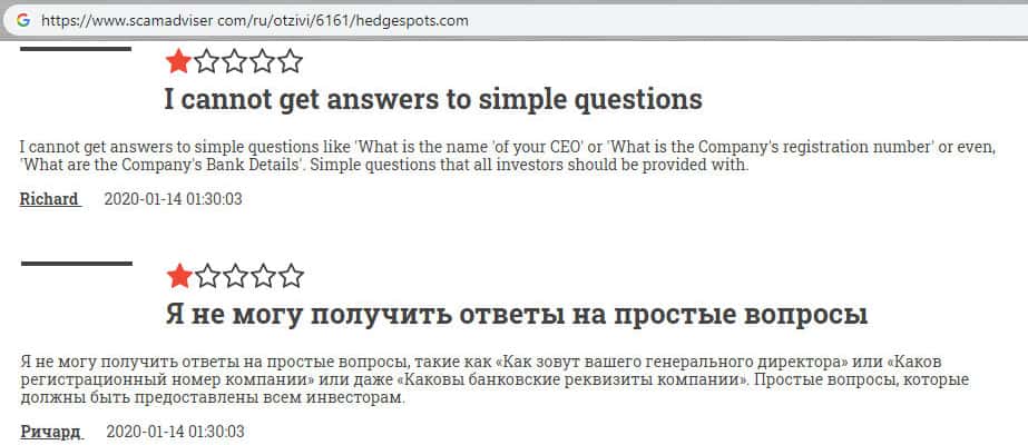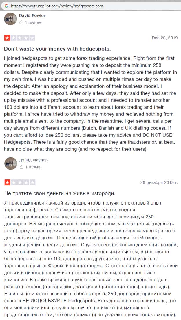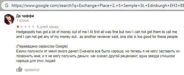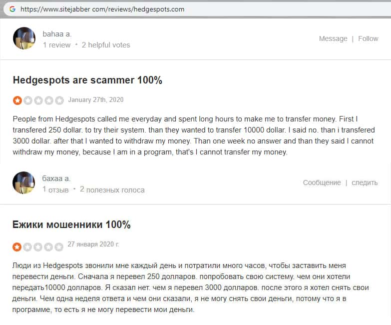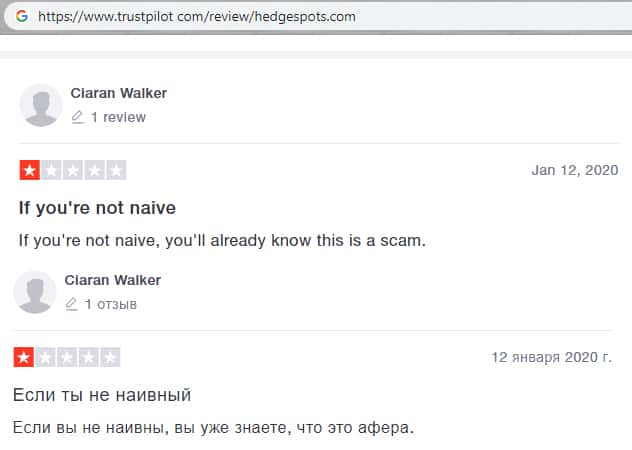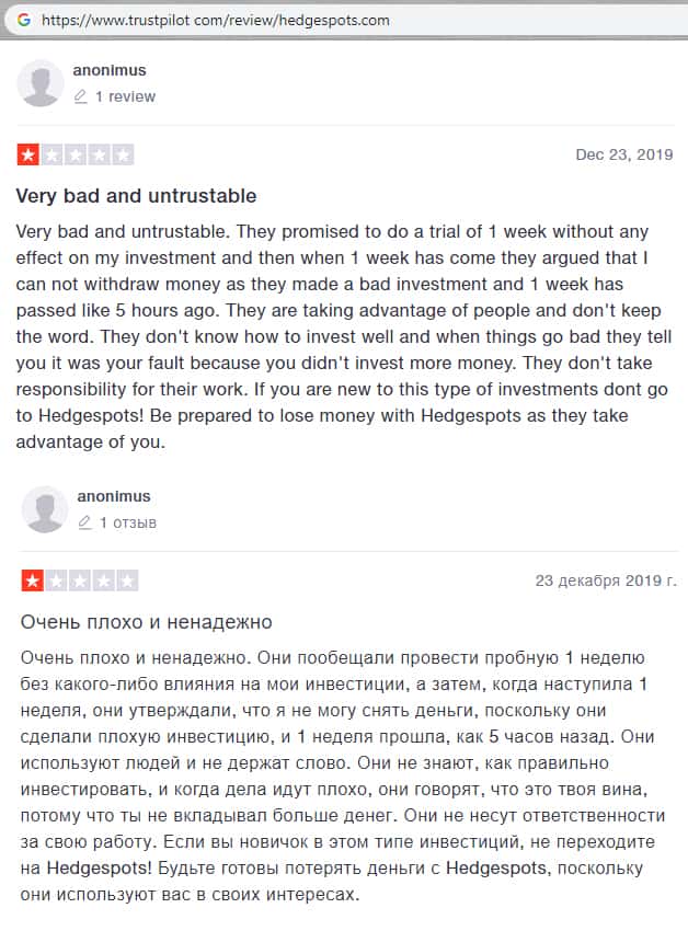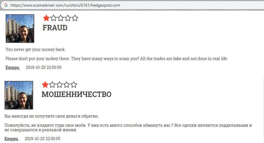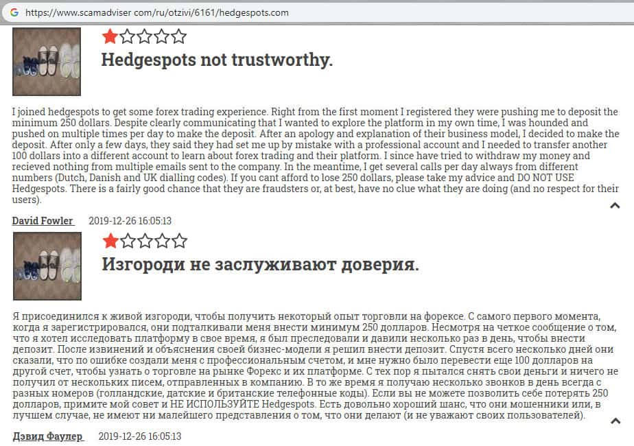 - Гневный комментарий от пользователя сети об мошеннической конторе HedgeSpots