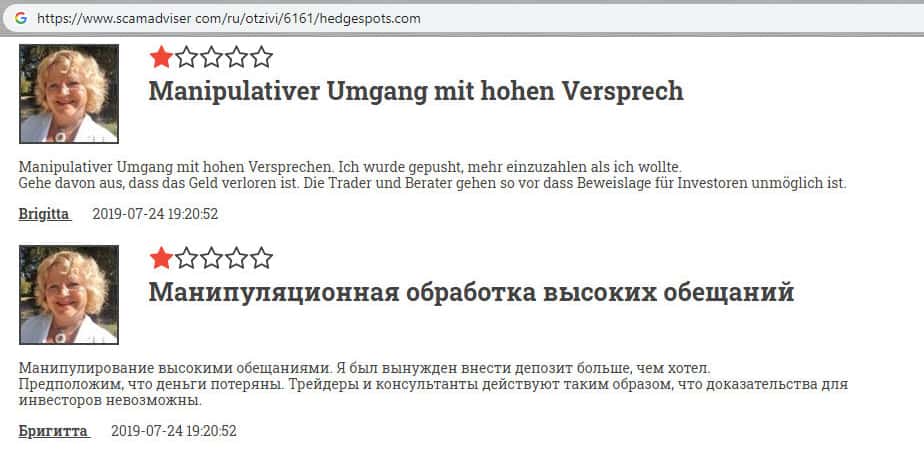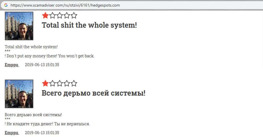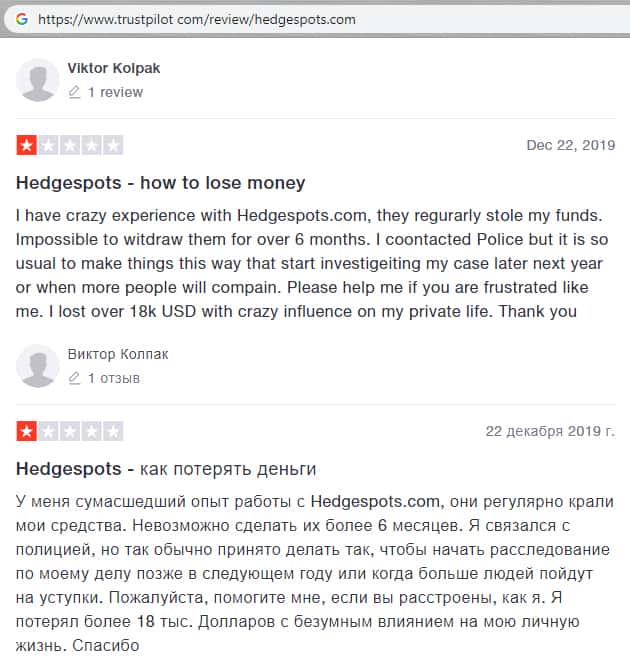 У данного комментатора на известном форуме об мошеннической компании HedgeSpots есть огромный опыт в трейдинге и в работе с криптоброкерами. Но он также подвергся уловкам мошенников из шараги Хейдж Спотс. Трейдер пытался связываться с полицией, чтобы вернуть свои кровные и честно заработанные денежные средства, но плодов это не дало и деньги не вернули.