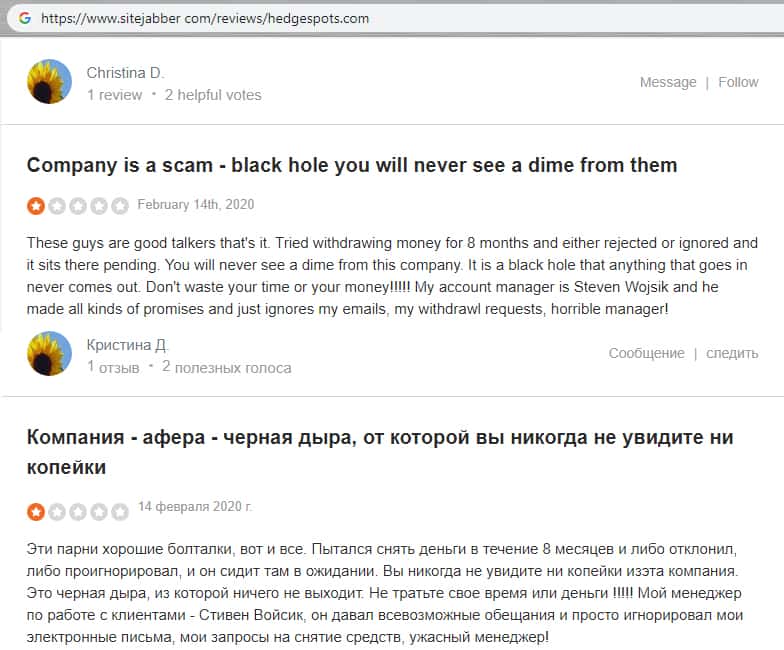 На одном из известных форумов, потерпевший пользователь рассказывает о том, что мошенническая контора HedgeSpots отлично умеют заговаривать зубы потенциальным клиентам, которые хотят зарабатывать большие деньги. Кроме всего этого, у данной мошеннической организации отвратительная техническая поддержка пользователей в любых вопросах.