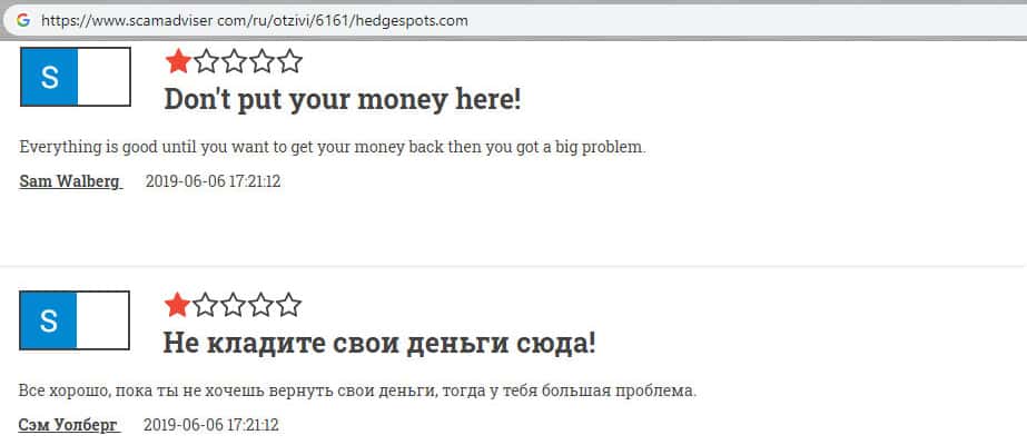 "Всё хорошо, пока ты не хочешь вернуть свои деньги, тогда у тебя большая проблема", - так высказался пользователь на известном форуме об мошеннической конторе HedgeSpots. Не ясно: пользователь работал с мошенниками или нет, но ясен факт того, что лохотрон очень любит обманывать пользователей на большие суммы денежных средств, несмотря ни на что.