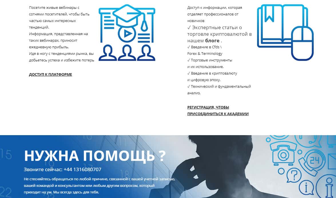 Спускаясь ниже по сайту мошеннической организации Хейдж Спотс, Вам будет предложено пройти вебинары и пройти обучение на сайте компании соответственно за денежные суммы. Но как итог, Вас ничему не научат, и просто на просто заберут Ваши денежные суммы, которые вы добровольно вложили. Также, они предлагают свою "помощь", которую дадут, если позвонить.