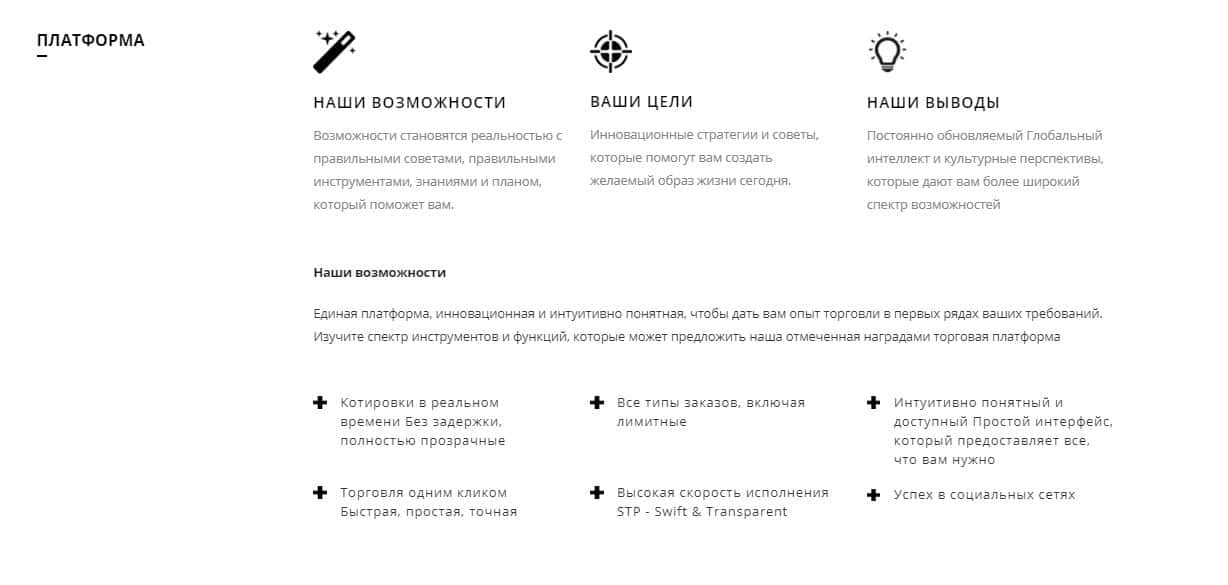 Начнем мы из самого начала вкладки "О платформе". Здесь, кидалы и разводилы снова твердят о том, что они лучше всех, и рассказывают о том, какие они крутые ребята. Указывают на то, что якобы, удобная платформа для торговли из любой точки мира через один только веб-сайт, потому как загрузка не нужна как для смартфонов, так и для персональных компьютеров.