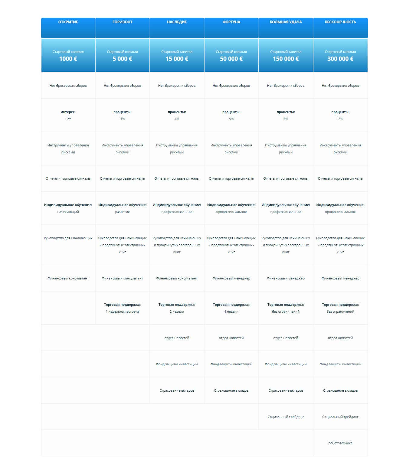 Далее, на сайте противозаконной организации HedgeSpots Вам предлагает выбор в шесть видов аккаунтов, как говорят сами мошенники. У каждого типа аккаунта требуется внести определенную сумму денег на счёт компании. К каждому типу счёта предлагается перечень услуг, которые, якобы, будут выполнены. Следовательно - чем дороже аккаунт, тем больше функций.