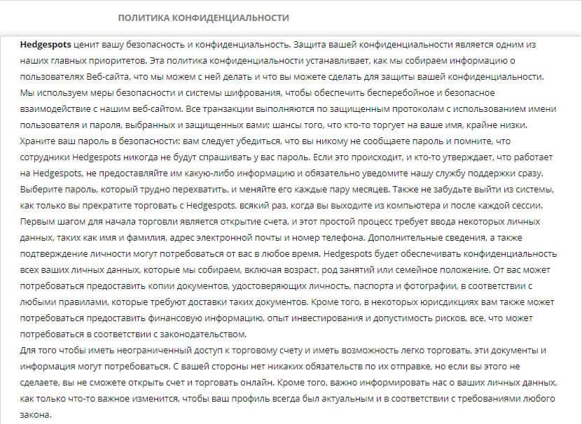 Начнем с того, как противозаконная организация преподносит свою политику конфиденциальности своим потенциальным клиентам. Мошенники утверждают, что они ни в коем случае не будут давить на своих клиентов, дабы те могли спокойно работать. Но сама суть в том, что если Вы не предоставите свои документы шулерам из шараги HedgeSpots, они не дадут торговать.