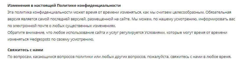 Об изменениях в политике конфиденциальности данного криптоброкера, имеющего название HedgeSpots всё довольно просто. Вся та политика конфиденциальности, которая есть на сайте - последняя версия. Кроме того, шулера могут менять политику конфиденциальности без вашего уведомления. То есть Вы должны постоянно проверять на наличие изменений документа.