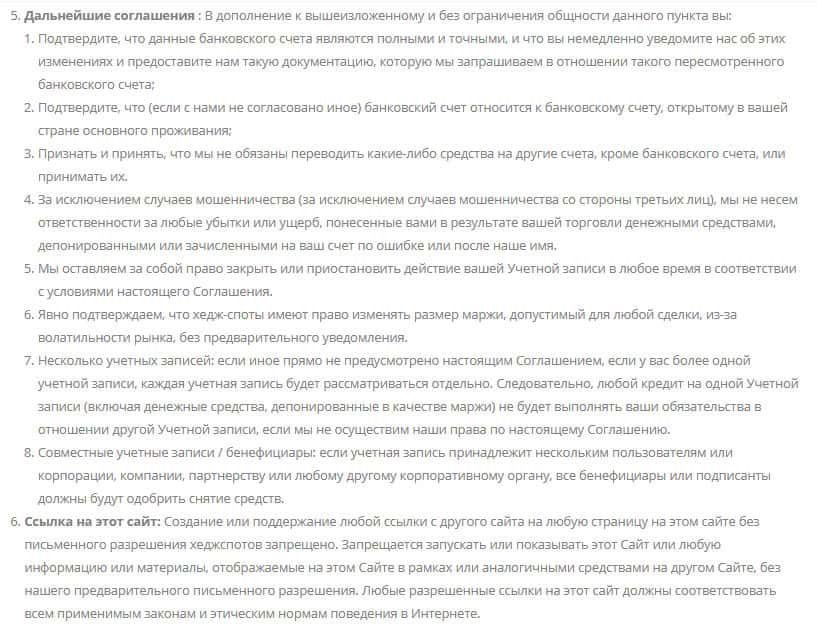 Почти в конце своего пользовательского договора, шулера ввели перечень того, что Вы обязаны делать при работе с данными шулерами из компании Хейдж Спотс. А именно, первым они выделили данные о банковском счете, который Вы представляете. Кроме всего этого, мошенники не несут ответственности за причиненный ущерб в результате работы с компанией.