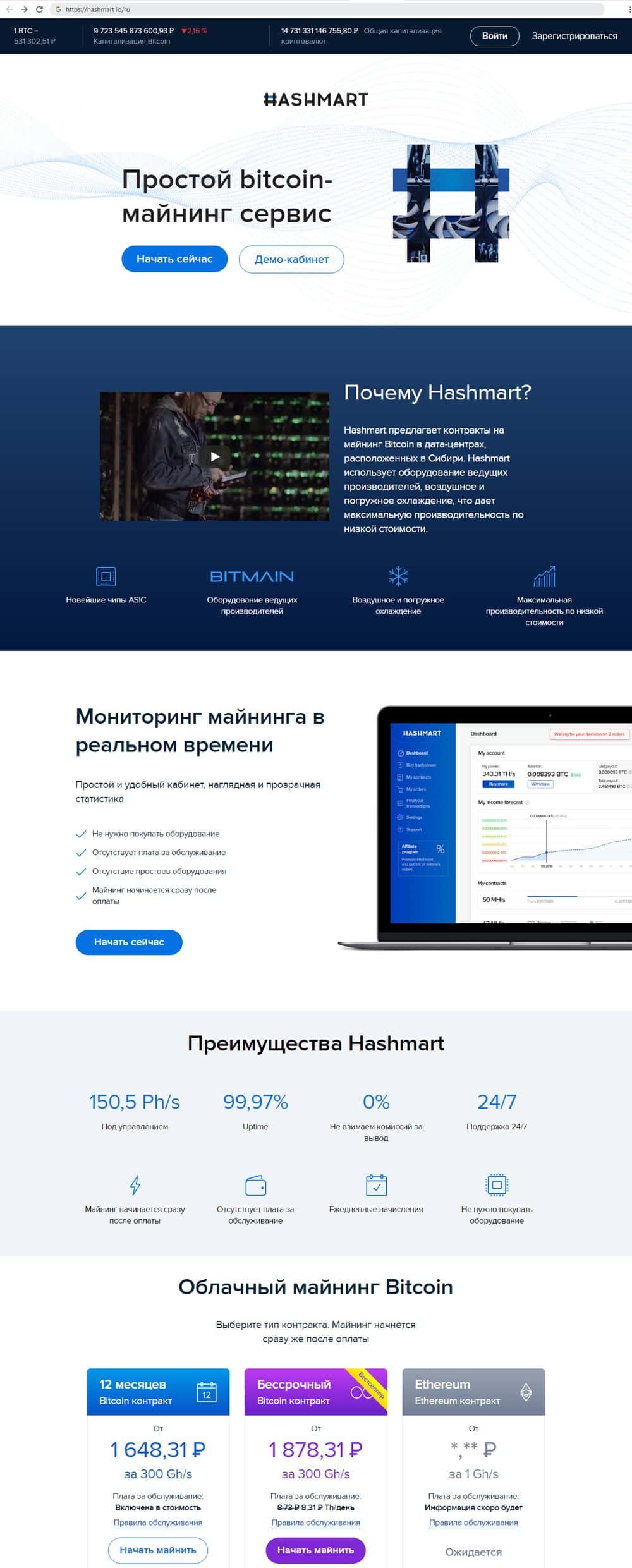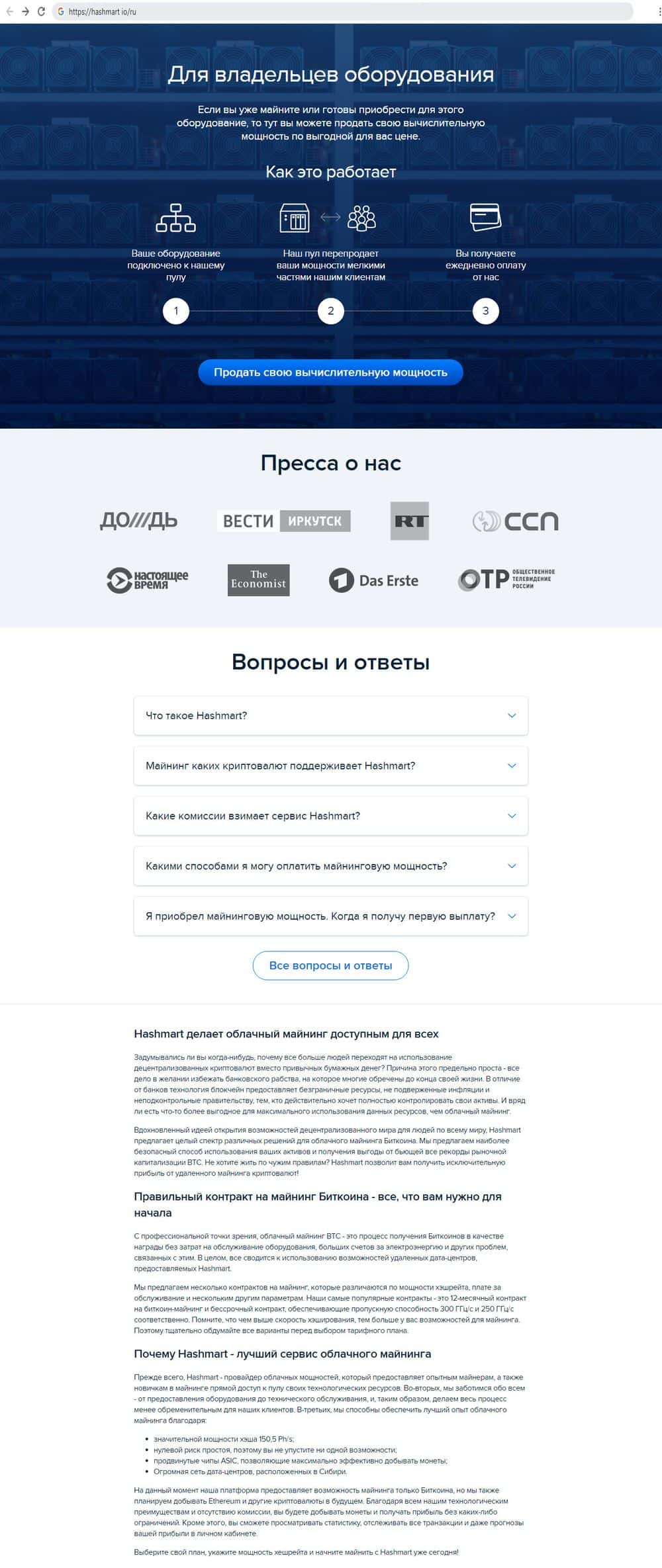 HashMart - фейковый bitcoin-майнинг сервис, который предлагает якобы самое современное оборудование, расположенное в дата-центрах в Сибири. Трейдерам предлагают наблюдение за процессом в реальном времени, достаточно заказать и оплатить планы. Доказательств, что кто-то получил хоть какую-то прибыль через этот сервис, нет.