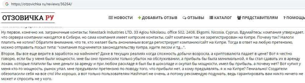 Пользователей удивляет, что контора, зарегистрированная на Кипре, держит оборудование в Сибири - отмазка про дешевое электричество так себе. На ум сразу приходит, что жулики Хэш Март купили карты, поняли убыточность затеи и сдают их, чтобы отработать затраты да еще и прикурить за счет лохов. Так думают на сайте otzovichka ru.