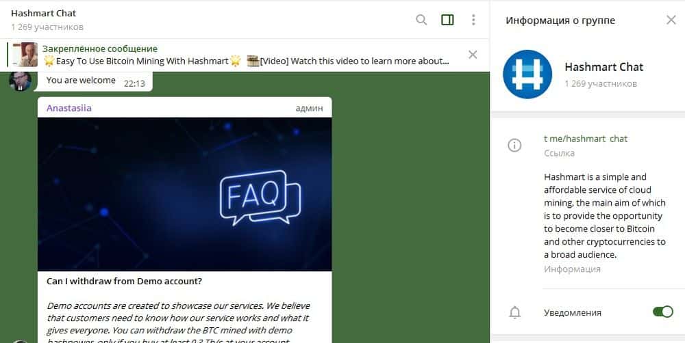 У лохотронщиков HashMart есть свой канал в Телеграм. На него подписаны чуть больше 1000 человек, но это не говорит о том, что канал так популярен. Просто это один из самых доступных способов связи с мошенниками. Ведется только на английском языке и полностью копирует контент двух предыдущих ресурсов.