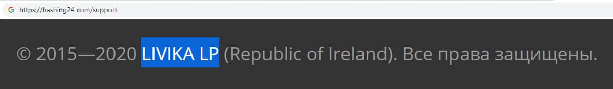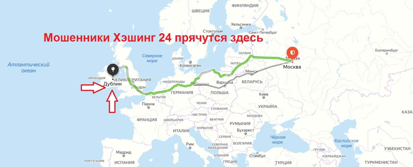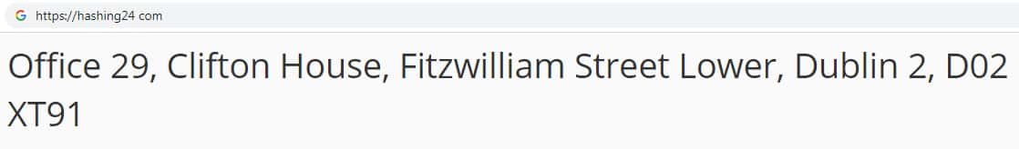Сведения о месте регистрации Хэшинг 24 - фейк, так как большинство проектов у себя на сайте указывают адрес местонахождения на территории Дублина, столицы Республики Ирландия в качестве приманки.