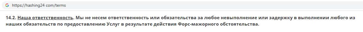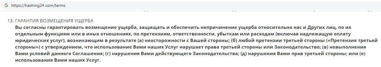 Согласно тому, что аферисты пишут в соглашении, скам-компания Хэшинг 24 не несет никакой ответственности за не полученную прибыль клиентом, а так же за возможные убытки.
