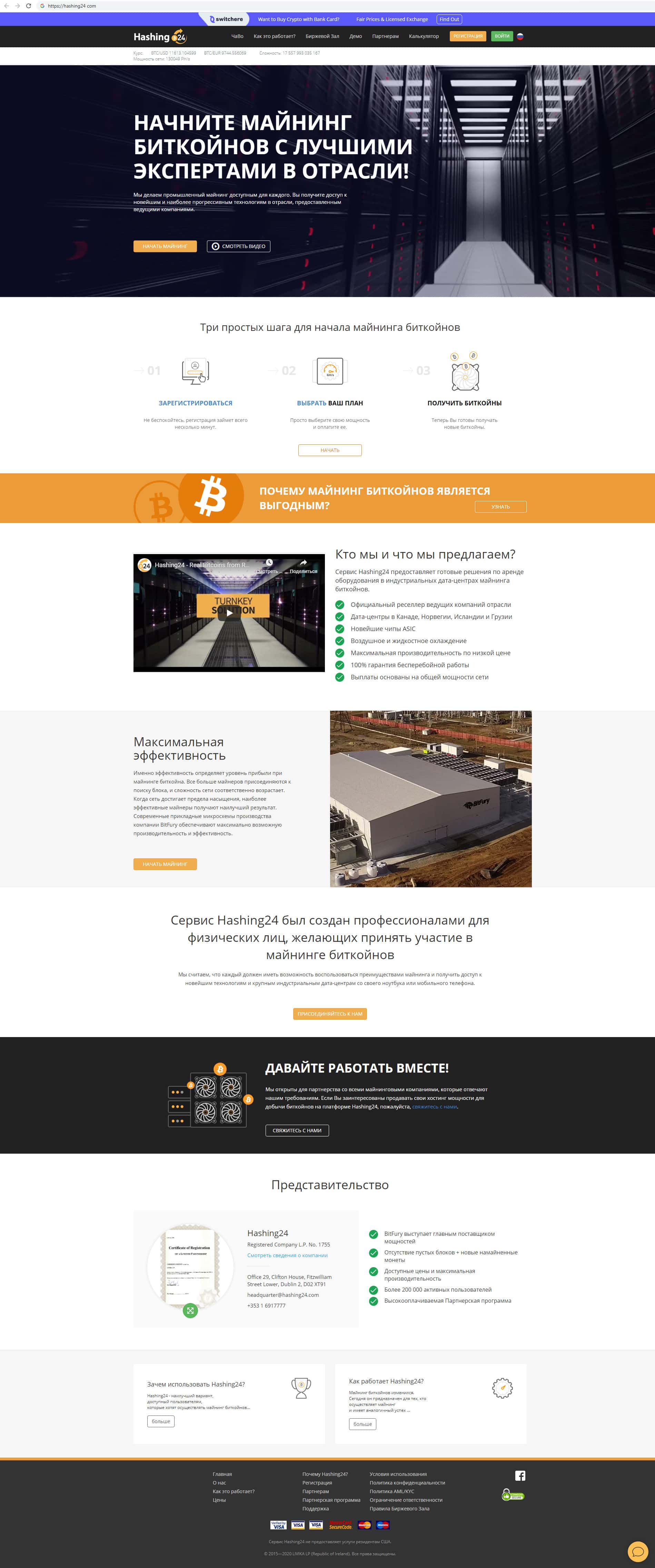 В данном разделе предлагаем увидеть скрин главной страницы веб-ресурса жульнической организации Хэшинг 24, помните о том, что такие проекты очень быстро скамятся.