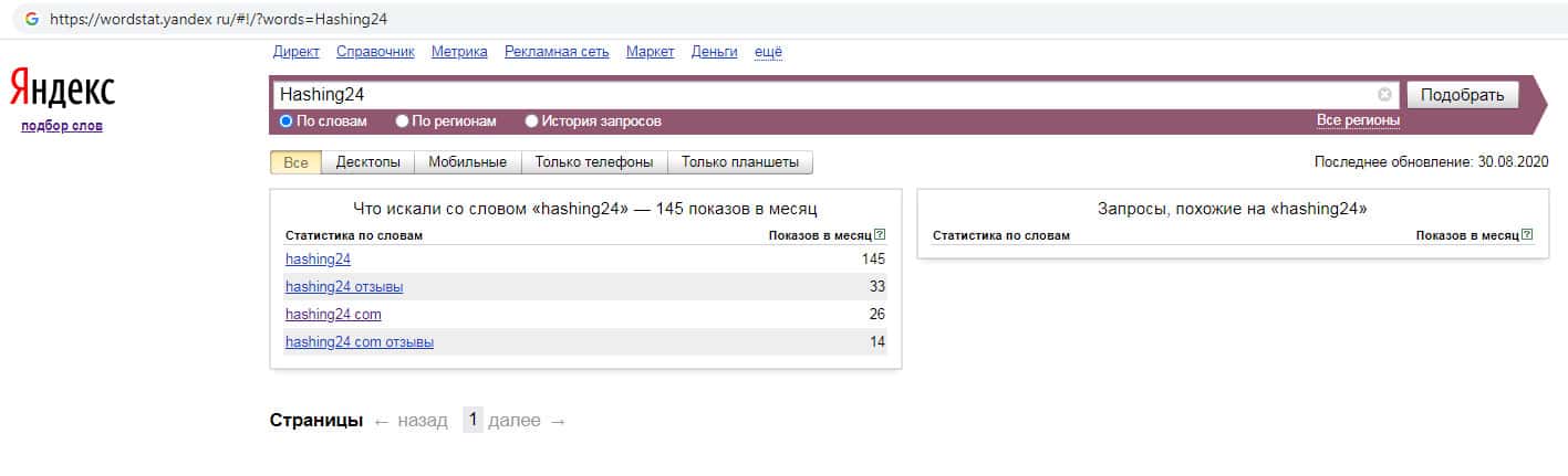 Количество брендовых запросов англоязычного названия компании без пробела "Hashing24" на Вордстарт Яндекс Ру составляет 145 запросов за месяц.