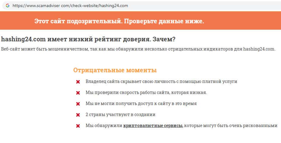 - Уровень доверия к сайту жульнической конторы Hashing24 низкий