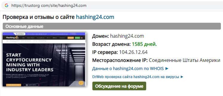 Проверка интернет-сервиса аферистов Hashing24 на trustorg com показала, что возраст домена к моменту написания статьи составляет 1585 дней, скорее всего домен купленный.