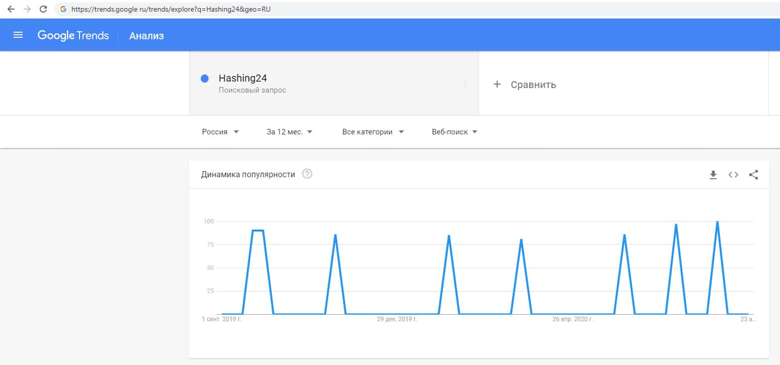 В поисковике Гугл отслеживается некая динамика популярности бренда англоязычного названия компании с пробелом, а именно "Hashing24".