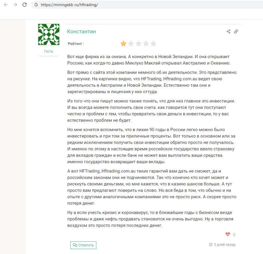 Пользователь написал отзыв о компании разводил HFTrading, в котором высказал своё мнение по поводу компании. Он рассказал, что фирма является оффшорным мошенником, так же не имеет права предоставлять услуги гражданам стран СНГ, так как они никак не защищены юридически перед фирмой. Так же он добавил, что жулики не дают никаких гарантий сохранности средств.