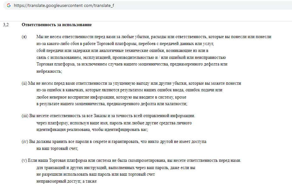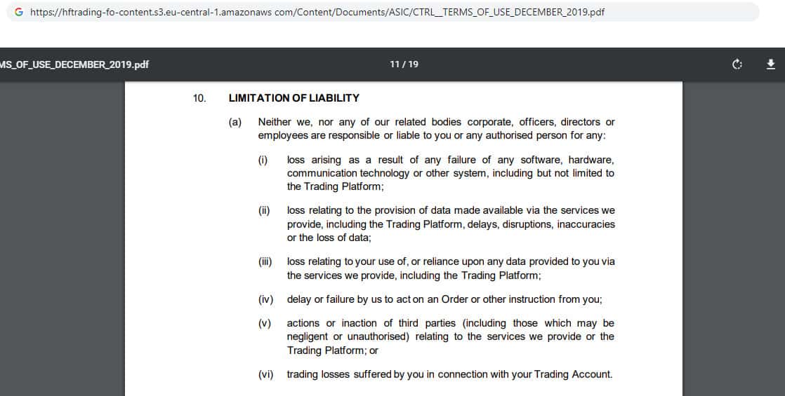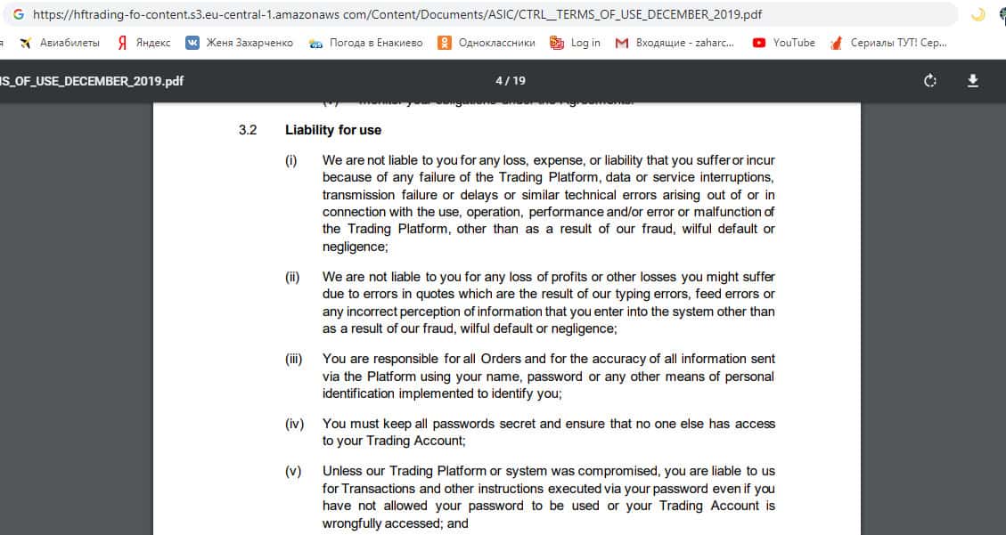 На сайте лохотронщиков ХФ Трейдинг есть документ под названием "Условия использования". В документе нет ничего такого если бы не несколько пунктов, в которых компания отказывается от ответственности за информацию, которую предоставляет пользователям, так же за упущенную выгоду. Всю ответственность переложили на клиента.