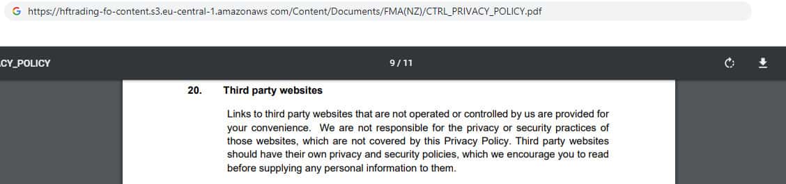 Лохотрон ХФ Трейдинг на своём сайте представил свою политику конфиденциальности. В ней так же нет ничего подозрительного, кроме пункта, в котором говорится о том, что фирма не отвечает за личную информацию клиента, которую используют партнёры компании. То есть партнёрские фирмы могут смело использовать данные клиентов в своих мошеннических целях.