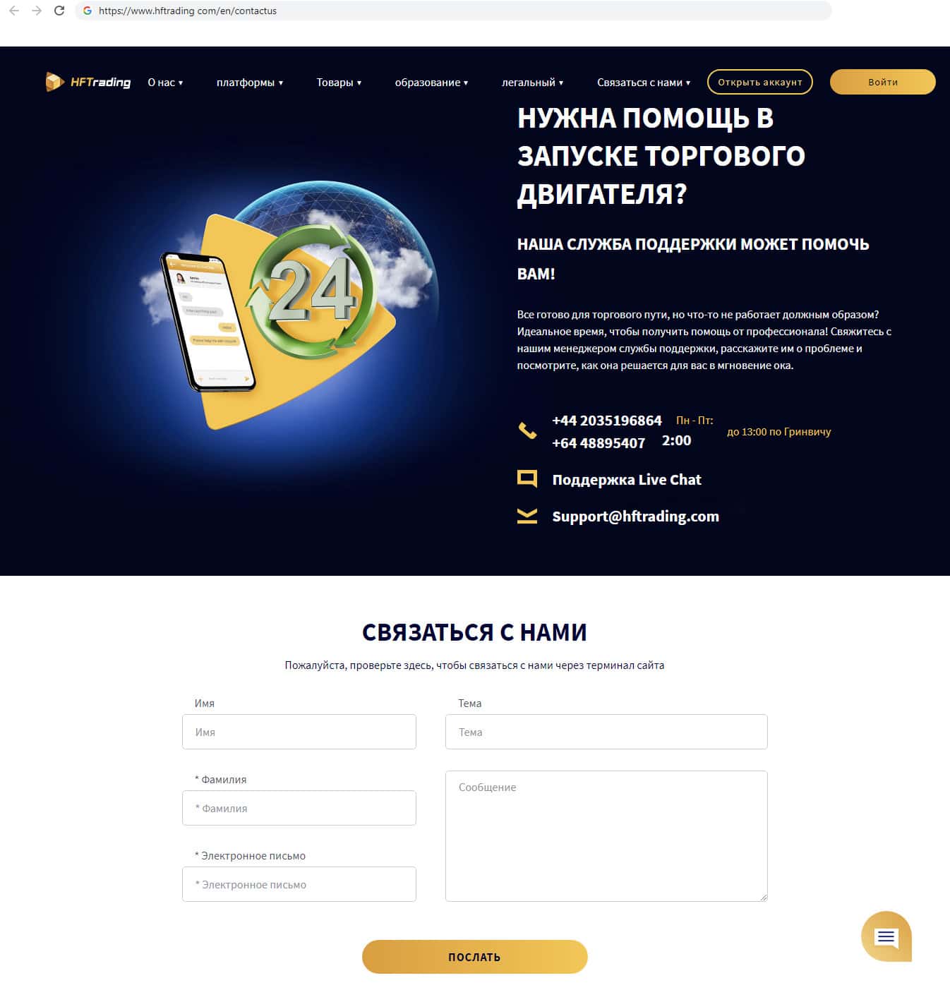 Мошенническая компания HFTrading предоставила свои контактные данные. Фирма указала номер телефона, и адрес электронной почты. Так же с жуликами можно связаться через сайт, заполнив форму связи с компанией. Но нигде не нашёлся адрес главного офиса фирмы, ни на сайте компании ни в сети. Контакты мошенников: