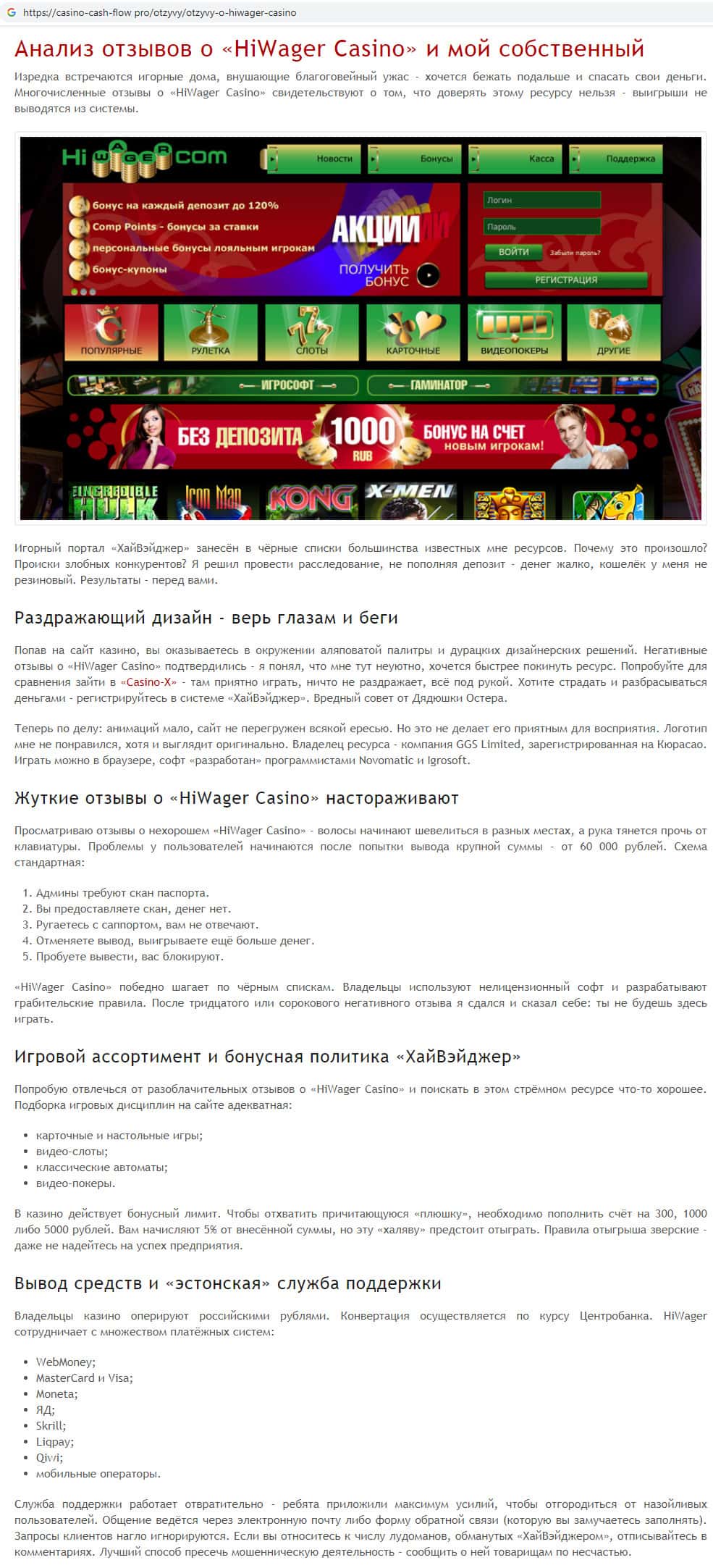 На веб-ресурсе casino-cash-flow pro скам-организация Хивагер Казино числится в черном списке фейковых контор, на сайте которых очень легко потерять все свои деньги заигравшись.
