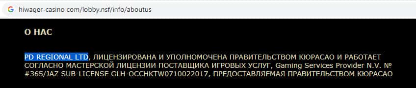 Юридическое лицо PD REGIONAL LTD владеет мошенническим сервисом hiwager-casino com, компании Хивагер Казино, у которой оффшорная регуляция Кюрасао.