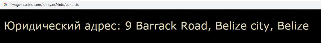 Лохотронщики Хивагер Казино указали адрес местонахождения главного офиса своей компании, который наверняка липовый:
