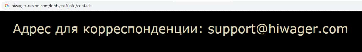 Аферисты Хивагер Казино на своем официальном интернет-ресурсе указывают адрес электронной почты, а именно:
