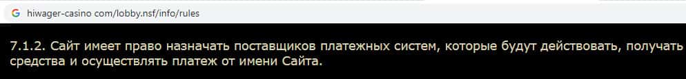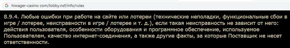 В случае возникновения каких-либо проблем с выводом денежных средств, шарага Хивагер Казино будет обвинять во всем неисправность платежной системы.
