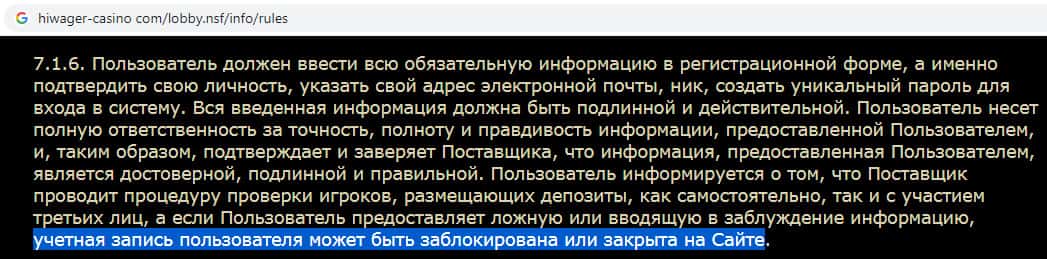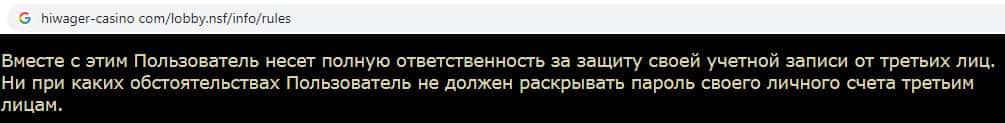Клиентское соглашение предоставленное шулерами Hiwager Casino