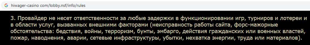 Ниже предоставлена полная версия клиентского соглашения жульнической организации Hiwager Casino, которое подтверждает то, что перед нами интернет-лохотрон.