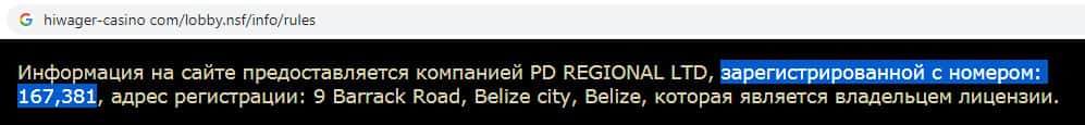 На своем официальном сайте шулера Hiwager Casino предоставили регистрационный номер своей компании, который проверить на сайте оффшорного регулятора невозможно.