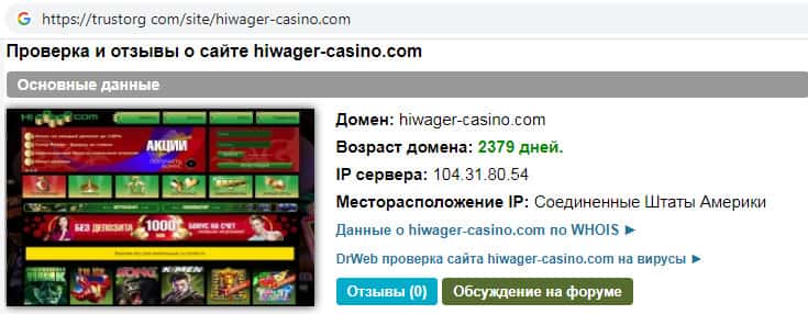 Проверка веб-ресурса аферистов Hiwager Casino на trustorg com показала, что возраст домена к моменту написания статьи составляет 2379 дней, скорее всего домен купленный.