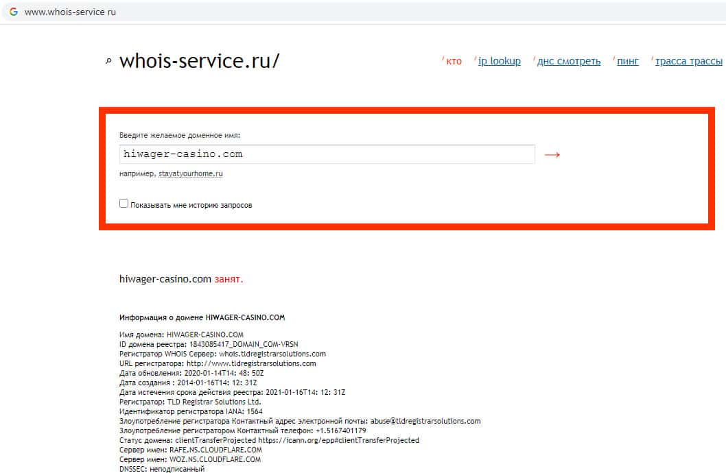 Проведя анализ данных по сайту Hiwager Casino, не было обнаружено информации о владельце домена, что является еще одним признаком того, что имеем дело с лохотроном.