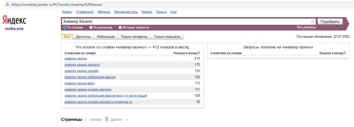 По брендовым запросам на wordstat yandex ru русскоязычного названия компании с пробелом "Хивагер Казино" 412 показов за месяц.