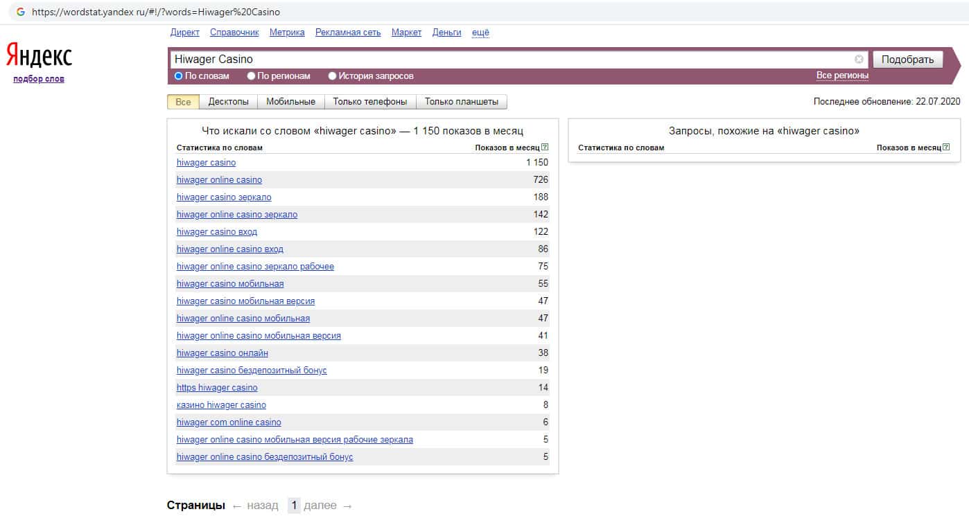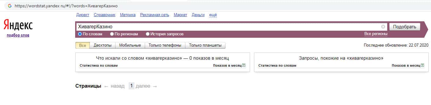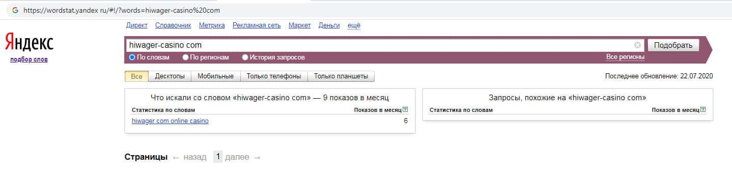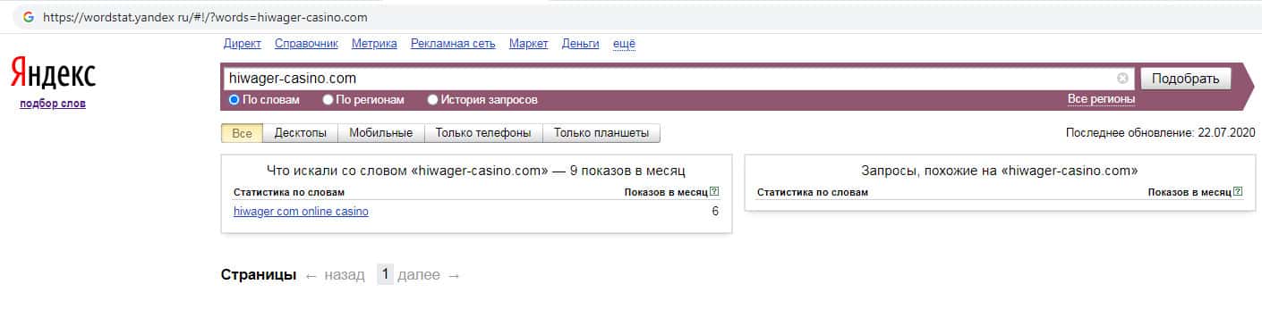 На Яндекс Вордстарт также был проверен бренд англоязычного названия компании без пробела "HiwagerCasino", где показатель 0 запросов за месяц.