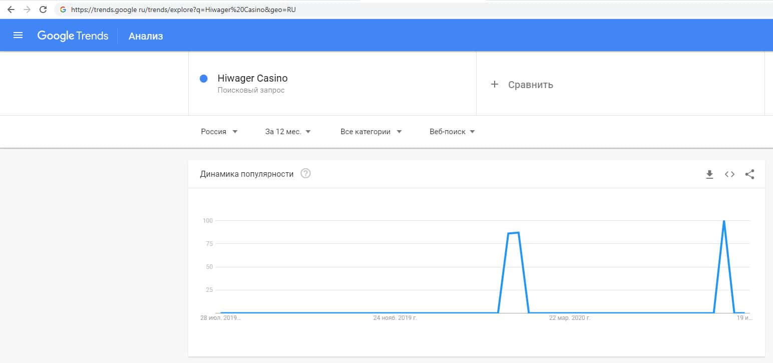 На веб-сервисе trends google ru так же отсутствуют запросы по бренду русскоязычного названия компании с пробелом "Хивагер Казино".