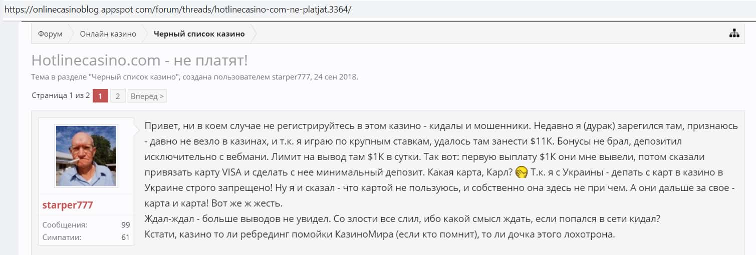 Следующая публикация взята на onlinecasinoblog appspot com, где HotLineCasino находится в черном списке, и здесь же на форуме пострадавший делится сведениями про этих мошенников.