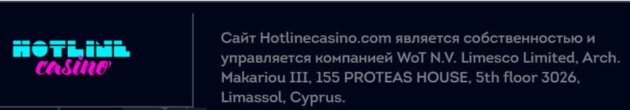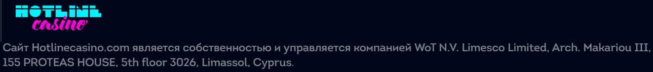Казино HotLineCasino Com принадлежит юридическому лицу WoT N.V. Limesco Limited, которое зарегистрировано на территории оффшорного государства Кипр.