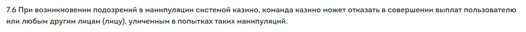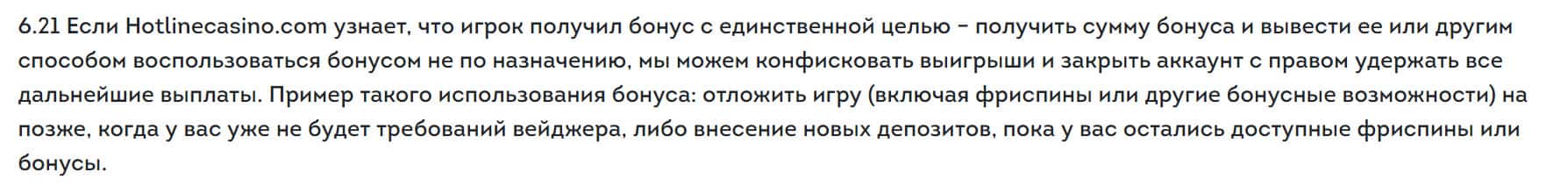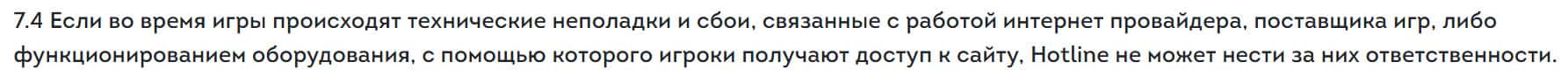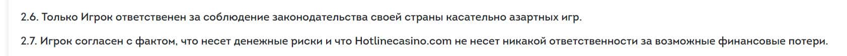 Ниже на скрине размещен очередной подставной пункт клиентского соглашения мошеннической компании ХотЛайн Казино.