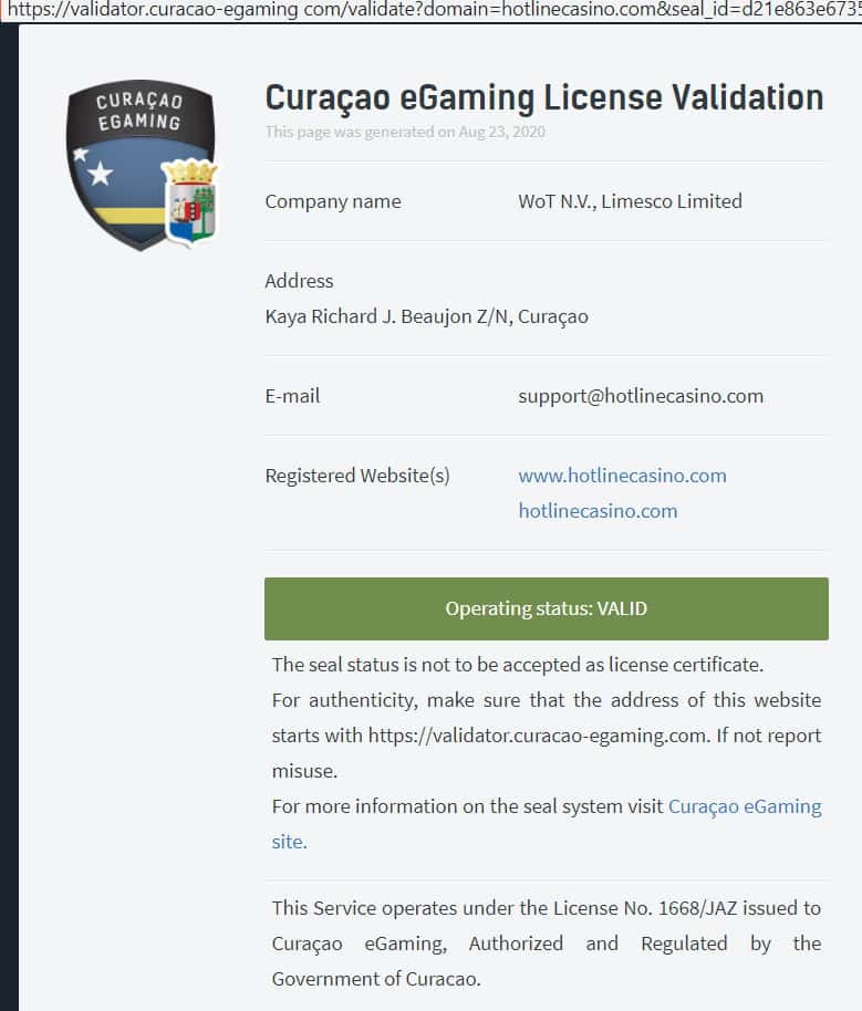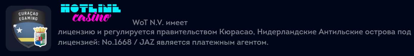 На сайте Хот Лайн Казино опубликована информация о том, что данное казино имеет лицензию оффшорного регулятора в Кюрасао, скрин с этими сведениями приводим ниже.