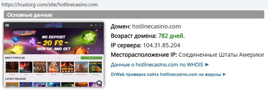 На сайте ТрасТорг Ком удалось определить возраст скам проекта ХотЛайнКазино, эти мошенники облапошивают наивную часть онлайн-сообщества уже более 2 лет.