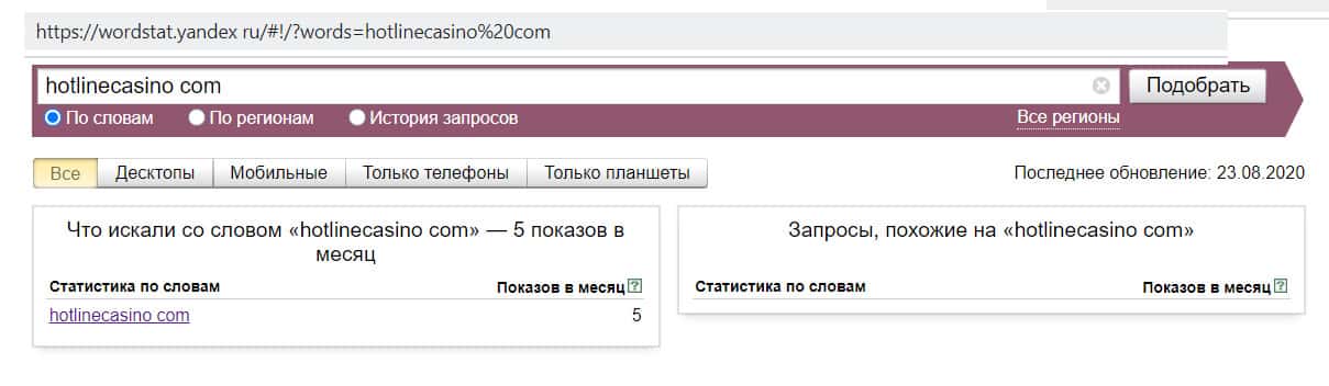 По запросу "hotlinecasino.com" тоже 5 показов. Жулики Хот Лайн Казино вероятно больше пользуются популярностью у русскоязычного потребителя, следующие анализы запросов покажут это.