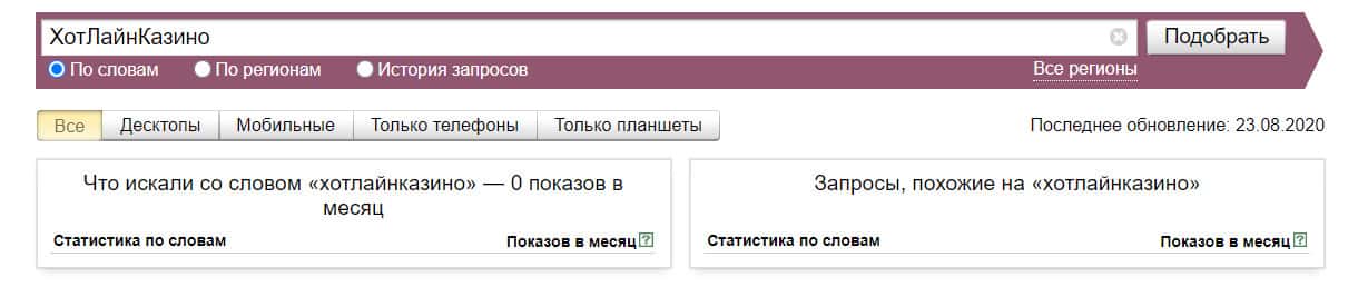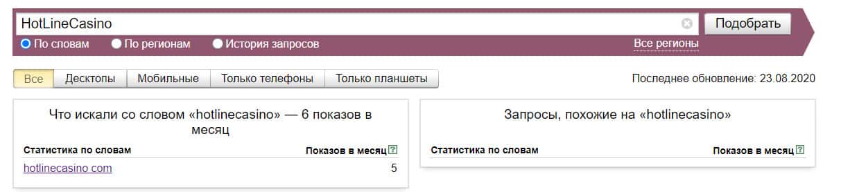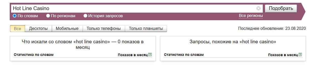 А вот по запросу "ХотЛайнКазино", русскоязычный вариант названия этого фальшивого казино, количество показов в месяц равно нулю.