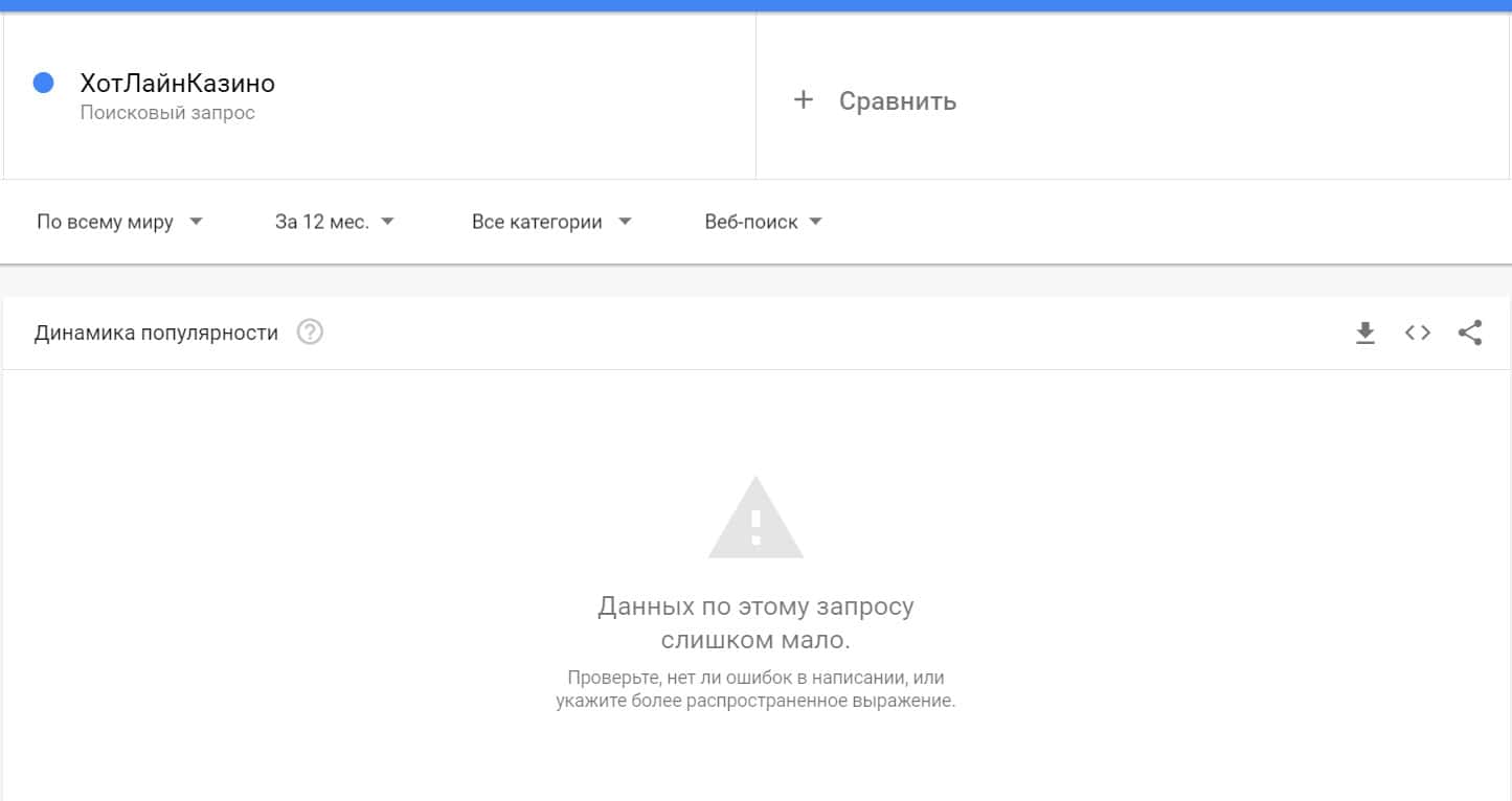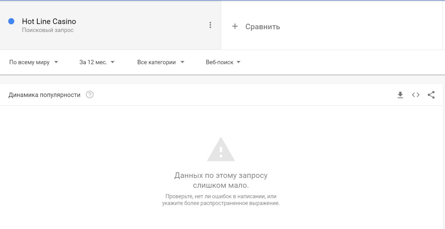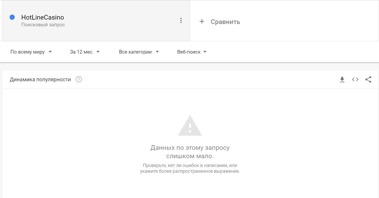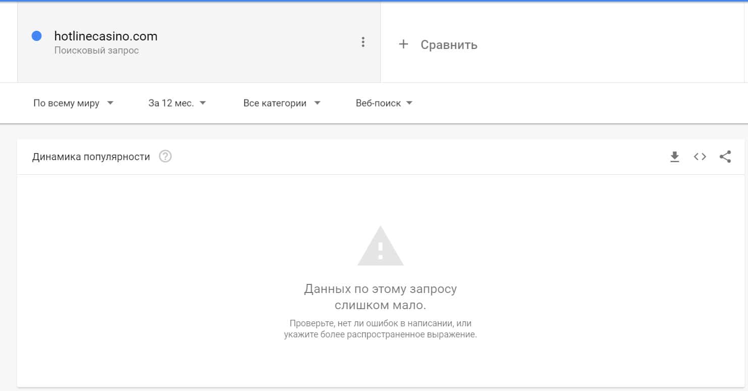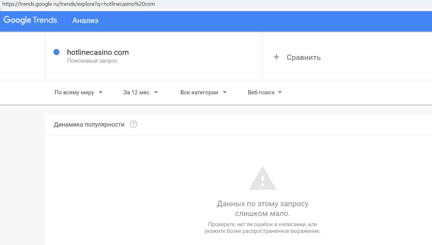 Аналогичная ситуация и по запросу "hotlinecasino.com", в поисковой системе гугл отсутствует информация о популярности данного бренда.